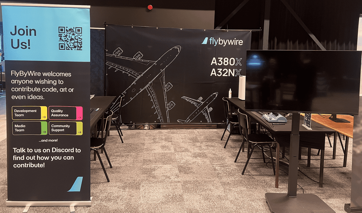 FlyByWire Simulations was present at FSWeekend with a large booth and fourteen of our most dedicated developers and team members. We welcomed hundreds of fans to our booth who got to try out flying the A32NX and our new project, the A380X.